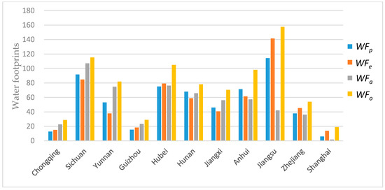 As shown in Table 2 and Figure 2, compared with the original WFo, the average reductions of water footprints under population (WFp), economy (WFe), and land area (WFa) are 29.33%, 28.75%, 32.67%, respectively. In the allocation scheme WFp, the relationship between the mean of optimization results of the upstream, midstream, and downstream in the YREB is . In the allocation scheme WFe, the relationship between the mean of optimization results of the upstream, midstream, and downstream in the YREB is . In the allocation scheme WFa, he relationship between the mean of optimization results of the upstream, midstream, and downstream in the YREB is .