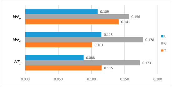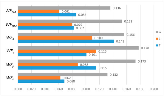 In order to further compare the differences between WFOM, WFEM and among WFp, WFe, and WFa, the T, L, and G indices of WFOM and WFEM are calculated, as shown in Figure 4 below.