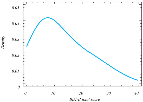 The average overall BDI-II score was 12.7 (+/−1.34; 95% CI), which is within the minimal level of depression but with a standard deviation (SD) of 9.27 that range minimal, mild and moderate levels. The distribution of the scores obtained cannot be regarded as normal at a 5.0% significance level (Shapiro–Wilk test), and shows a positive skewness that implies a large accumulation of individuals around the lower depression level (modal value 8), while the numbers drop steadily until reaching the maximum depression value (see Figure 1).