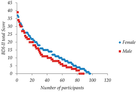 Of the 185 participants, 97 were female (52.4%) and 88 male (47.5%). The mean female score value was 13.5 (+/−1.86, 95% CI); a value quite close to the mild depression level which starts at 14. The average male score was 11.8 (+/−1.97, 95% CI) (minimal depression level) (see Table 3, Figure 2, Figure 3). There was no statistically significant difference between male and female average scores (α = 5%).