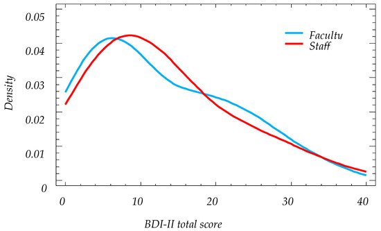 Smoothed density plot of BDI-II scores for staff and faculty.