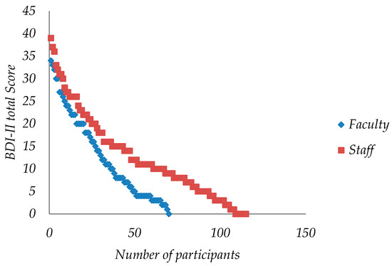 Statistical summary of BDI-II scores by group (staff and faculty).