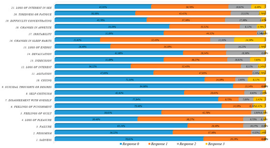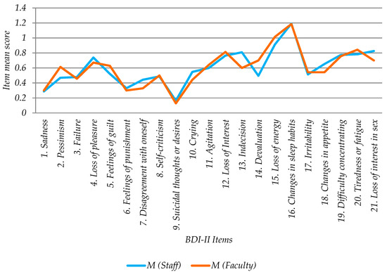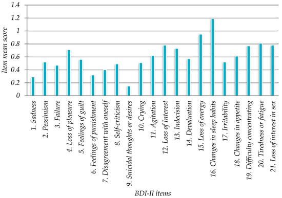 The main depression-associated factors found in the study were: “16. Changed sleep habits” (1.19), “15. Loss of Energy” (0.95), “20. Tiredness or Fatigue” (0.81), “12. Loss of Interest” (0.78), which could be used as indicators for future measures designed to prevent depression in the university. In Sanz et al. (2003) [37] the highest value was also “16. Changes in sleep habits” (0.75) followed by “15. Loss of energy” (0.73), “19. Difficulty concentrating” (0.68) and “20. Tiredness or Fatigue” (0.81). Thus, online BDI-II item’s values for university workers were similar to the previous study related to adult (general population) [37] (Table 8 and Figure 11).