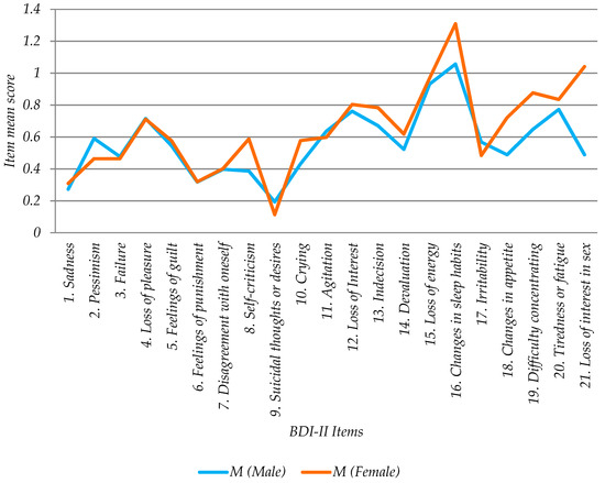 There were no significant differences by gender associated with BDI-II total scores. However significant differences were found by gender in the following items: “18. Changes in appetite”, “19. Difficulty of concentration” and “21. Loss of interest in sex”. The last question was the one with the greatest gender difference; males expressed less loss of interest in sex than females with a statistically significant difference. Thus prevention actions should consider the needs by gender in the context under study.