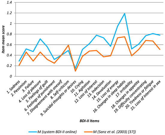 Mean values (M) of 21 BDI-II items in system online BDI-II vs Sanz et al., (2003) [37].