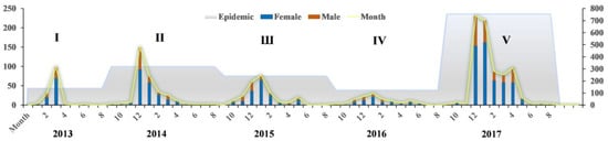 Figure 1 shows a fluctuating curve and bars of the number of cases by epidemic and monthly interval. At the scale of epidemic cycle, the bar chart displays two highs and two lows. There was a sudden outbreak in 2013, with a peak in number during the second epidemic. The number of cases then decreased after 2014, reached a historic low at the fourth epidemic, and then peaked again at the end of the studied period. It is remarkable that 316 cases arose during the second period, a number almost triple that in 2013. In the next two years, the number dropped steadily due to effective prevention and isolation measures of the Chinese government. The affected population gradually decreased to an all-time low (119 cases) in the fourth epidemic. The fifth epidemic, which ended on 30 September 2017, is represented by 751 laboratory-confirmed cases. These cases represent 48.2% of all infections, with this epidemic being the largest to date. At the monthly scale, A(H7N9) infections continue for 58 months, with an average of 26 cases per month. The black curve shows regularity in the timeline because of the virus’ seasonal appearance. The numbers typically increased to a peak in the first quarter of each year, especially in January and February. The numbers then declined significantly in the second quarter. The numbers then decreased to minimal levels or even to zero when entering the third quarter. Infections then reappeared in September and increased slowly during the fifth quarter. A rapid increase was observed around the transition from December to January of the next year. Fluctuations in number were observed among the periods. Overall, the highest incidence occurred in January and February 2017, with both months exceeding 200 cases. The number of A(H7N9) infections in January and February was 8.9 and 8.4 times the average monthly value, respectively. The next highest numbers of cases were observed for January 2014, with 149 cases, and April 2013, with 97 cases. There were no people affected in June, August, or September 2013, in July or August 2015, or in August or September in 2016 due to high temperatures. Compared with the corresponding month of the previous years, each month of 2017 had a significantly higher number of infections, with the peak value of the past five years occurring in this year.
