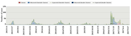 For the entire studied period, the weekly number of H7N9-infected individuals was also calculated, as shown in Figure 2. It was found that, for the primary cluster, the observed number within the cluster was greater than the expected number. In addition, the greatest number of infections broke out in the fifth period, from April to June. The periods of secondary clusters had similar observed-to-expected ratios outside the cluster, which were smaller than 1. These time periods showed high probabilities of aggregation. They were irregularly distributed from 2013 to 2017, particularly in the winter–spring transition.