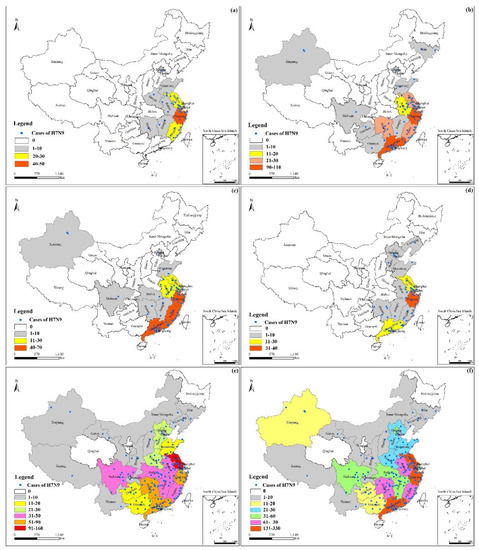 The avian influenza A(H7N9) virus caused various levels of damage in the 28 provinces and 183 prefecture-level cities in Mainland China, as shown in Figure 3. The results showed clear spatial differences among different areas. As shown in Figure 3f, cases of A(H7N9) infection were significantly more abundant in some regions than in others, with higher frequencies in the coastal provinces of Southern China than in the inland provinces. The highest concentrations of cases occurred in Eastern China, especially in the vicinity of the Yangtze River Delta, including Zhejiang Province, Jiangsu Province, and Fujian Province. The total number in these three provinces represented a 46% proportion of the cases in Mainland China.
