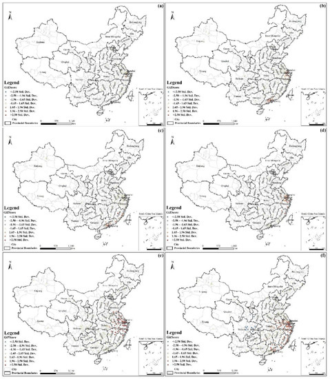 Figure 5. Maps showing the hotspot and cold spot for influenza A(H7N9) human cases in China. (af) represents the first phase epidemic, the second phase epidemic, the third phase epidemic, the fourth phase epidemic, the fifth phase epidemic, and all epidemics in the past five phases, respectively.
