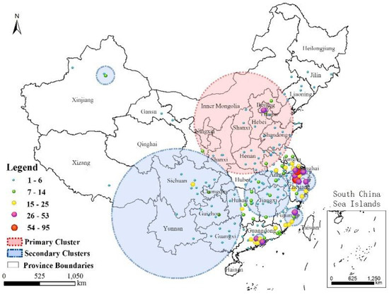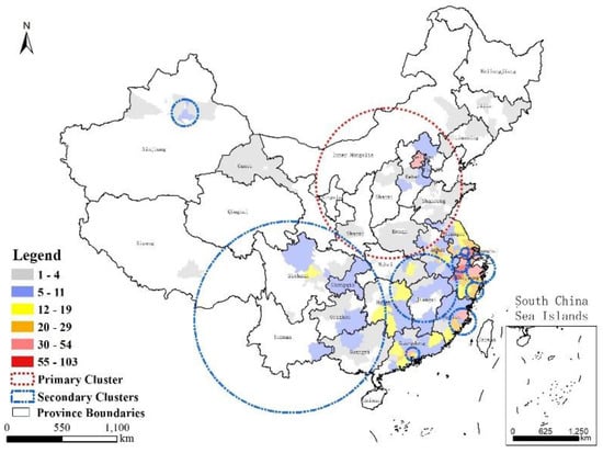 Figure 6. Distribution of the clusters and the occurrence frequency of the A(H7N9) virus in space.