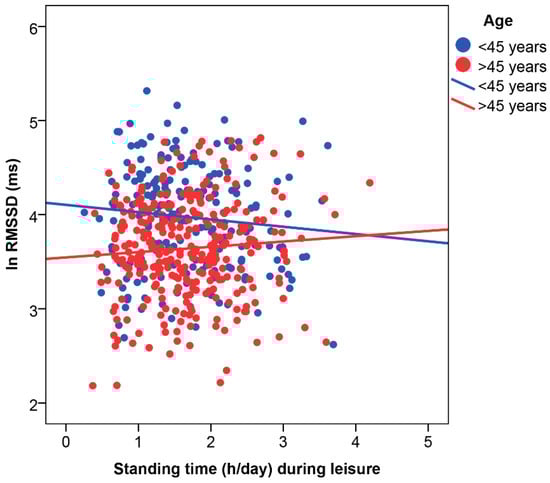 Interaction between age and standing time during leisure on nocturnal parasympathetic cardiac modulation. RMSSD: root mean square of successive differences between R-R intervals; ln natural: logarithm.
