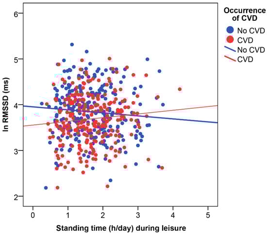 Interaction between cardiovascular disease (CVD) and standing time during leisure on nocturnal parasympathetic cardiac modulation. RMSSD: root mean square of successive differences between R-R intervals; ln: natural logarithm.