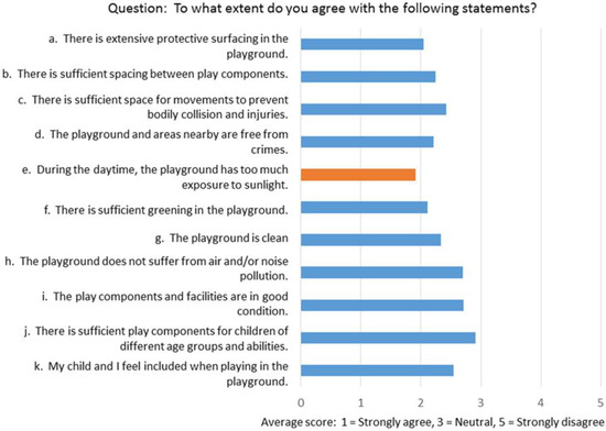 Results of the questionnaire survey based on a 5-point Likert scale show that parents were generally pleased with the provision of play space and the play equipment (Figure 2) except for the negative comment on too much sun exposure due to a lack of tree cover or overhead protection. Although there was no obvious negative comment about disabled access, many parents/guardians (15–35%) were not aware of amenities for people with disabilities (such as ramp, stair lift, tactile guide path, braille, etc.). They were rather positive about playgrounds being accessible to children with varying abilities (mean score = 2.2 out of 5 where 1 is strongly agree). However, environmental audits of access trails between selected playgrounds and nearby housing estates reveal major problems needing attention.