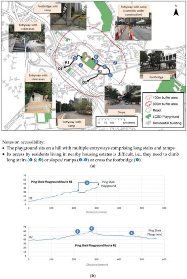 (a) Accessibility issues of the Ping Shek Playground in Kwun Tong District, 2016. (b) Vertical profiles of routes R1 and R2 to Ping Shek Playground in Kwun Tong District, 2016.