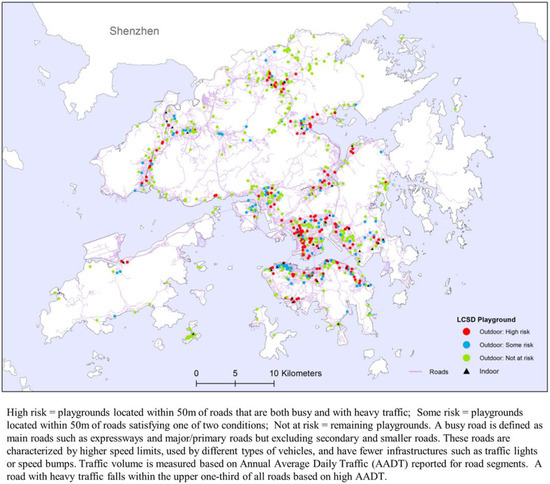 The use of GIS methodology has enabled considerations of factors not normally included in the evaluation of play space. Existing provision of play space can be analyzed against potential demand at the district and region levels to identify mismatches in different dimensions of need and risk. The criteria for defining need and risk in this study recognize that a variety of factors can influence children’s environmental affordances and these factors can change over time as children grow and develop. In this study, a playground is considered safer if it is situated away from major roads (i.e., highways and primary roads) and its air quality better if it is located away from roads based on high annual average daily traffic (AADT) counts. Although children’s knowledge of the world and their ability to act accordingly have been shown to be conditioned by distance [34], the qualitative distinction between relations of near and far has remained unclear. Here, 50 m was selected as the separation threshold between a playground and other urban features (such as roads or land use types) given the very compact city configuration of HK whereas 300 m (equivalent to 15–30 min of walking) was used as the accessibility threshold between playground and home locations. These distance thresholds are informed by research/practice and they can be adjusted easily in a GIS setting pursuant to changing circumstances.