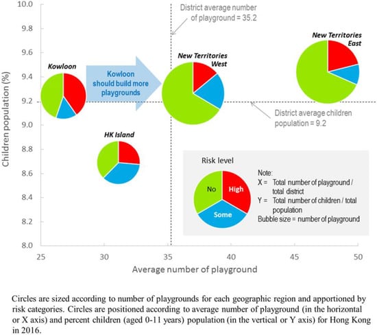 Playgrounds by risk levels by regions of Hong Kong against average number of playground and percent children population, 2016.