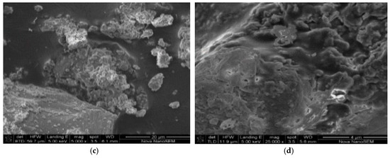 Scanning electron microscopy (SEM, Figure 1a–d) shows the surface structure of the most activated clay. The images consist of the fine particles of irregular shape and size on external surface with a micro-rough texture. The morphology of the clay in Figure 1a and b shows an irregular porous structure at lower magnifications. At higher magnifications, the clay soils images show a smooth irregular surfaces, and an expanded honeycomb, flared, “cornflake” and platy like texture (Figure 1c,d). The characteristic images show typical smectite clay surfaces which is consistent with the results obtained by [23].