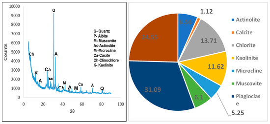 X-ray diffraction (XRD) analysis shows that the activated clay sample is mainly composed of the following mineral phase which are plagioclase, quartz, chlorite, kaolinite, actinolite, muscovite, microcline, calcite and albite (Figure 3a). The quantitative results further confirm the presence of plagioclase (smectite rich clay soil) (31.09%) and quartz (24.55%) as the major minerals and the presence of chlorite (13.71%) and kaolinite (11.62%) as minor minerals (Figure 3b).