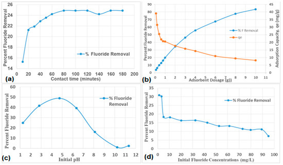 The pH of the medium plays a significant influence on fluoride adsorption and help in understanding fluoride sorption mechanism of the adsorbent. The effect of initial pH on percent fluoride removal was evaluated by varying the initial pH of the medium from 2 to 12 by using 0.1 M HCl and 0.1 M NaOH. From the results (Figure 6c), the activated clay showed fluoride sorption efficiency over a range of pH 2 to 7. The percent fluoride removal increased as pH increased from 2 to ≈ 5 and thereafter decreases steadily until pH 10–12. The optimal pH with a fluoride removal of about 48% was observed at pH of 5. At lower pHs, the clays’ surface is positively charged and hence fluoride is electrostatically attracted to the clay surface, which explains higher fluoride sorption between pH 2–5. While at higher pH the sorption of fluoride reduces as the surface becomes negatively charged and therefore a repulsion between the surface and fluoride anions. The chemistry of fluoride removal at different pH could also be explained by relating it to the point of zero charge of the adsorbent. refers to the pH at which the adsorbent has zero net charges on the surface. Above the the clay adsorbent is negatively charged and below the the clay adsorbent is positively charged. Higher adsorption at lower pH range of 2–5 lead to the assumption that chemisorption predominates while lower adsorption at higher pH range of 7–12 is suggestive of physisorption.