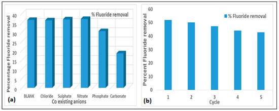 (a) Effects of co-existing anions on fluoride removal by the activated clay (at 10 mg/L fluoride, 2.0 g/100 mL adsorbent dosage and 30 min contact time at 250 rpm) and (b) Percent fluoride removal by activated clay in successive cycles (at 5.44 mg/L fluoride, pH 6.0 and 60 min contact time at 250 rpm).