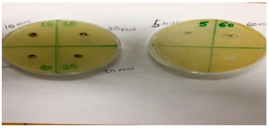 Figure 8 shows pictorial view of the plates and the six bored holes containing the mixtures of the activated clays and the E. coli strains that are being investigated for antibacterial activities via zone of inhibition measurements. The six clay samples were activated at varying contact times of between 5 and 60 min. From Figure 8, it can be observed that all the six samples within the bored holes do not inhibit the bacterial strains and hence they have no zone of inhibition, thereby indicating that they do not have any potent activities against the E. coli strains used in this study.