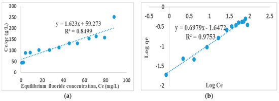 (a) Langmuir, and (b) Freundlich adsorption isotherms. (10 mg/L fluoride concentrations, 2 g/100 mL adsorbent dosage and 60 min contact time at 250 rpm. Fluoride concentration was varied from 1 to 100 mg/L).
