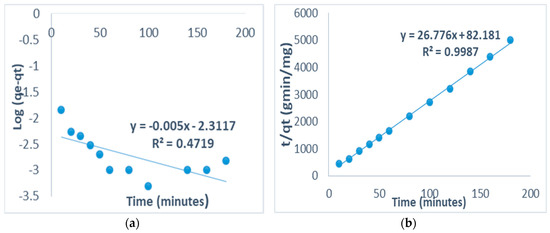 The fitness of the pseudo-second-order model (Equation (11)) on the sorption of fluoride on the clays’ surface was investigated. The plot of t versus t/qt gives a straight line with higher correlation coefficient, R2 = 0.99, which is much higher than that observed with pseudo-first-order model (R2 = 0.4719) indicating that the pseudo-second-order model is more applicable and viable (Figure 10a,b).