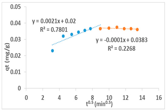 Both particle (Equation (12)) and pore (Equation (13)) diffusion models have been applied and the values of kp and ki shows that kp = 1.0 × 10−4 min−1 while ki = 2.1 × 10−3 mg/min1/2. Higher correlation coefficient, R2 = 0.7801 indicates the possibility of sorption process being controlled greatly by the particle diffusion while pore diffusion models with (R2 = 0.2268) is minimal in the sorption process (Figure 11). The constant values for adsorption isotherms and kinetics model is given in Table 6.