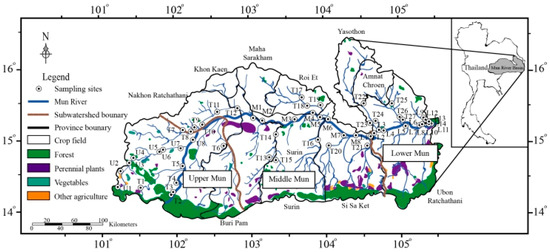 The Mun River, as the tributary of Mekong River, originates from Nakhon Ratchasima province, flows through 10 provinces, and joins the Mekong River in the Ubon Ratchathani province (Figure 1). It has a drainage area of 71,060 km2 (14° N–16° N and 101°30′ E–105°30′ E), and a total length of 673 km. The annual water discharge is about 2.5 × 109 m3 [37]. The Mun River Basin has a tropical savannah climate [39], leading to high rainfall from May to October with an annual precipitation between 800 and 1800 mm. The mean air temperature is from 25 to 30 °C. According to previous studies [37], the whole watershed is often divided into three sub-watersheds: the Upper Mun (101°30′ E–102°30′ E), the Middle Mun (102°30′ E–104°30′ E), and the Lower Mun (104°30′ E–105°30′ E).