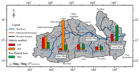 Thailand is one of the largest crop-producing countries [40]. In the Mun River Basin, the proportion of planted area has risen rapidly during the recent decades, specifically, the agricultural land took up 38% of the total area in 1994, 45% in 2004, and increased to nearly 80% in 2018 [37,40,41]. In addition, agricultural land can be divided into crop fields, vegetable fields, and other agricultural land, of which rice fields dominate (Figure 1). The rice fields in the Lower Mun account for a larger proportion than the Upper Mun (Figure 2). July is the vegetative stage of the crops in the Mun River Basin, which means more chemical fertilizers are applied [40]. A previous study [38] showed that agricultural activities resulted in overloading of soil nutrients, afterwards influencing the water quality in the Lower Mun. Moreover, with the development of industry over decades, factories are grouped in the Upper Mun (Figure 2), representing potential pollutant sources. Thus, it is crucial to investigate the water quality in the Mun River