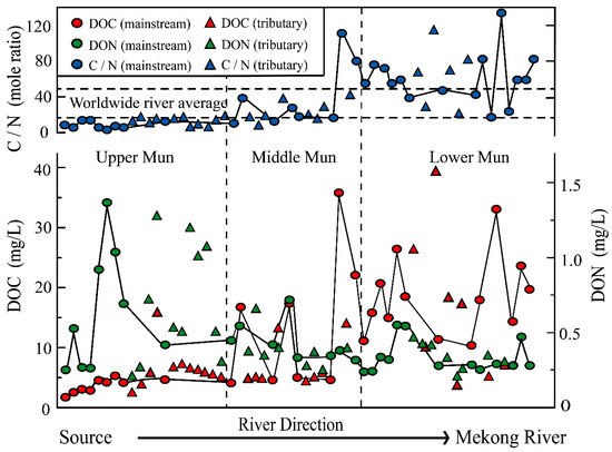 DOC showed strong correlations with DON in the Upper Mun and Lower Mun, respectively (Figure 5), which may imply DOC and DON have same sources at each sub-watershed. Previous study [56] reported an average ratio of DOC/DON of about 32.5 ± 16.3 for rivers worldwide. As shown in Figure 3, DOC/DON ratios in the Upper Mun are lower than the average value in rivers worldwide, while in the Lower Mun, DOC/DON ratios are clearly higher than the average values worldwide (Figure 3). Since the relative variation degrees of DOC were much larger than for DON, the ratios of DOC/DON observed in this study mainly depend on the DOC concentrations and result from anthropogenic inputs. In fact, the similar abnormal ratios have also been observed where the anthropogenic contaminations are serious [14,21,24]. Moreover, based on the industrial and agricultural terrain distribution in the Mun River Basin (Figure 2); more specifically, industrial terrain is concentrated in the Upper Mun, while the agricultural area is concentrated in the Lower Mun. The distinct DOC/DON ratios distributed in the upstream and downstream may result from different anthropogenic sources.