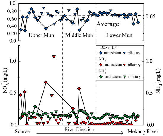 DON comprised the majority of TDN in Mun River, accounting for 27.5–88.8% (average 64.8%) of the TDN, (Figure 4), consistent with dominance of DON in the riverine N pool [50,51]. Some studies maintained that the observed high DON/TDN percentage may result from the biological effect: phytoplankton and microorganisms uptake the dissolved NO3− and NH4+, undergo series of complex biological processes, and then release DON through cell disruption and passive exudation [20,52]. In fact, the bacterial ammonification and nitrification can convert DON to NO3− and NH4+ conversely [53], and thus it is quite hard to discern which biological process dominates the reciprocal transformation of the N species. In contrast to some regional analyses which attribute turnover of nitrogen biogeochemical cycle to the biological effect and have significant linear correlation between the DON, NO3−, and NH4+ [24,54,55], there are no clear linear correlations between the N species in the Mun River (Figure 5, Table 2), indicating that both the local biogeochemical processes and the anthropogenic activities inputs play important roles in the Mun River.