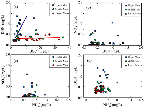Correlations between the DOC and species: (a) DOC vs. DON; (b) DON vs. NO3−; (c) NH4+ vs. NO3−; (d) NH4+ vs. DON.