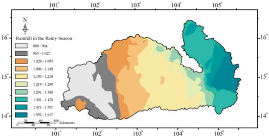Spatial patterns of annual precipitation in the wet season in the Mun River Basin.