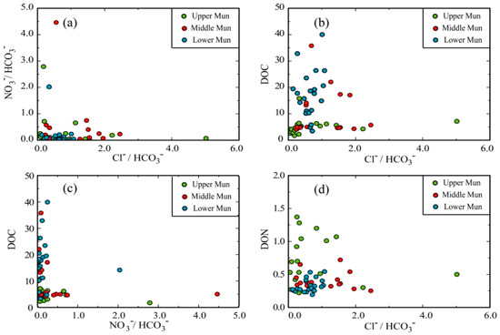As showed in Figure 7, the ratio of NO3−/HCO3− and Cl−/HCO3− exhibited no clear correlations in the Mun River Basin. However, it is unreasonable to deny the relationships between them, because they commonly follow same trend due to pollution [58]. The uncoupling between NO3− and Cl− in the Mun River Basin may due to two reasons: the relatively low concentrations of NO3− in the Lower Mun and riverine nitrogen biogeochemical processes. The biological effect may generate relatively large variations of NO3− and disturb the original ratio between NO3− and Cl−. There were no correlation between DOC vs. Cl−/HCO3−. As mentioned before, Cl− is mainly derived from industrial inputs while DOC comes from the agricultural input; the uncoupling of DOC and Cl− results from the different source. DOC vs. NO3−/HCO3− and DON vs. Cl−/HCO3− also showed no correlations. As previously mentioned, the complex local biogeochemical processes may disturb the original ratios of different components in exogenous inputs, thus it is not easy to find out the definite relationship between DOC, TDN and anthropogenic inputs. Nevertheless, the connections among these dissolved loads are objective facts [25,60]; the high concentrations of these forms of organic matter and the abnormal C/N ratios are correlated with human activity. Assessments of DOC and DTN concentrations can be conducted as per legislative requirements even if the sources are still unclear.