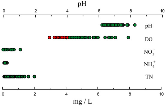 Water quality assessment of pH, DO, NO3−, NH4+, and TN in Mun River water. Based on the WHO and EC standard (pH, NO3− for the WHO standard and DO, NH4+, TN for the European Communities (EC) standard), the green point refers to water with good quality, the red point represents polluted water.