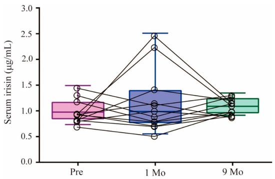 Changes in preoperative (Pre) circulating serum irisin concentrations with respect to the levels one (1 Mo) and nine months (9 Mo) after RYGBP; p = 0.0528 by Friedman’s F test.