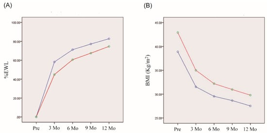 Comparison of the body-weight lowering effects of RYGBP during one year between two groups with increased or decreased irisin levels one month after RYGBP. (A) Changes in %EWL. (B) Changes in BMI. Blue and red lines represent groups with increased or decreased irisin levels one month after RYGBP, respectively. No significant differences were found between the groups (A, p = 0.296; B, p = 0.108 by 2-way RM ANOVA).