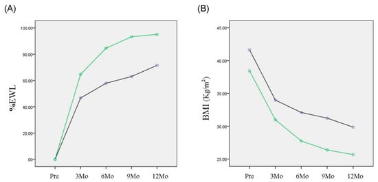 Comparison of the body-weight lowering effect of RYGBP one year after surgery between groups with or without elevated irisin levels detected nine months after RYGBP. Black and green lines represent groups with or without elevated irisin levels nine months after RYGBP, respectively. (A) The %EWL in the group without an elevated irisin concentration was larger than in the group with elevated irisin levels (p = 0.006 by two-way RM ANOVA). (B) The decrease of BMI in the group without an elevated irisin level was significantly greater than in the group with an elevated level (p = 0.032 by two-way RM ANOVA).