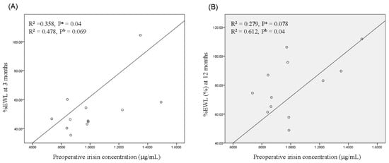 To analyse the association of preoperative serum irisin levels with weight reduction after RYGBP, we evaluated preoperative irisin levels and %EWL. As shown in Figure 4, preoperative irisin levels were correlated with %EWL at three months (β = 0.573; R2 = 0.478; p = 0.069, Figure 4A) and one year (β = 0.576; R2 = 0.612; p = 0.04, Figure 4B) after RYGBP, although the significance levels were marginal.