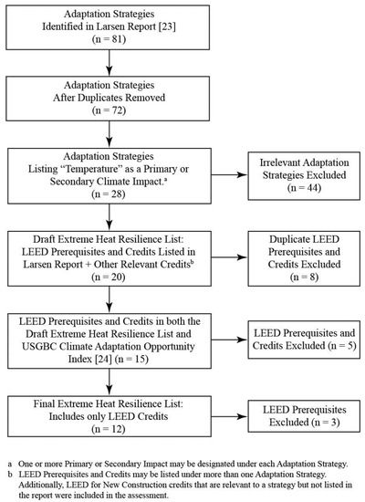 Following PRISMA guidelines (Figure 2, Figure A1), the review began with an assessment of the LEED credits referenced by 81 adaptation strategies associated with green building design outlined by Larsen [23]. Each adaptation strategy identified LEED credits with the potential to enhance a project’s ability to adapt to one of a suite of climate change-related hazards. Adaptation strategies were included in the systematic review analysis if “Temperature” was identified as either a primary or secondary climate impact in Larsen et al. (28 strategies). Examples include: shading devices, high performance glazing, roof and wall insulation, white and vegetated roofs, compact and mixed-use development, and increased vegetation. LEED prerequisites and credits that were identified as linked to an adaptation strategy were then included in the draft Extreme Heat Resilience list. As some prerequisites and credits were listed under more than one adaptation strategy in Larsen et al., duplications were removed. Credits that were relevant to an adaptation strategy but not included in the Larsen report (such as the ability of Energy & Atmosphere Credit 2: On-Site Renewable Energy to potentially enhance a building’s passive survivability during a heat-related power outage) were then added to the list, resulting in 20 Prerequisites and Credits. The draft list of LEED credits was then cross-referenced with the Climate Adaptation Opportunity Index developed by Pyke [24]. Five prerequisites and credits that did not appear in Pyke were excluded. And, finally, two prerequisites were removed from the analysis, because they are required for all LEED certified projects. In the end, 12 credits were included in the Extreme Heat Resilience systematic review (Table 1).