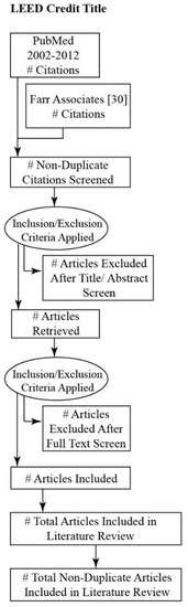 Following this preliminary review, queries were submitted in PubMed using National Library of Medicine Medical Subject Headings (MeSH®) [31] Terms. In some cases, more than one set of MeSH terms was submitted for a single credit. For example, for Sustainable Sites Credit 2: Development Density and Community Connectivity, the following MeSH queries were submitted. Related to Option 1—Development Density, the MeSH terms were: “Population Density” AND “Climate Change” AND “Urban Health”. Related to Option 2—Community Connectivity, the MeSH terms were: “Population Density” AND “Urban Health”. Additionally, eight citations were reviewed from the Farr report, five of which were relevant to the enquiry [32,33,34,35,36]. For simplicity’s sake, MeSH terms have been listed in Table A1 without outlining specific combinations. The Table A1 entry for Sustainable Sites Credit 2 lists “Climate Change,” “Population Density,” and “Urban Health” without reference to query combinations. See Appendix Table A2 for a table outlining the query combinations for specific LEED credits. Duplicate citations were removed. And, only articles in English from 2002 to 2012 were included in the analysis. Titles and abstracts were reviewed for evidence of links between strategies that could be used to comply with LEED credit requirements and their potential impact on the major elements of the conceptual framework (Figure A2): risk of exposure to extreme heat, environmental determinants of health (i.e., population exposure and/or built environment exposure), co-benefits to public health outcomes (i.e., relevant social/health outcomes, economic outcomes, and/or environmental outcomes), and co-benefits to built environment outcomes (i.e., relevant environmental outcomes). Articles that addressed one or more of these criteria were selected for a full text review. See Figure 3 for a generic flow chart illustrating the article inclusion process in general and Figure A2 for details on LEED credit included in the review.