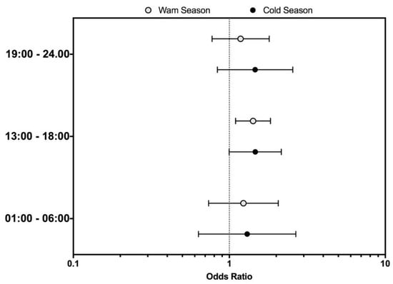 Comparisons were performed by occupational settings (i.e., manufacturing; finance, property and business services; wholesome and retail trade; transport, storage and post; agriculture; services, including health services; and construction industry, that was assumed as the reference category), by hour of the day (categorized as: 01.00–06.00; 13.00–18.00; 19.00–24.00, and 7.00–12.00 that, as suggested by Garbarino et al. [] was assumed as the reference category), by meteorological characteristics of the calendar day (categorized in: frost day; summer day; tropical night; and neutral day that was assumed as the reference category), occurrence vs. absence of HW, and kind of OIs.
