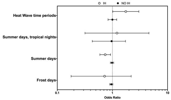 Interestingly enough, when we stratified by the season of occurrence, the increased risk was limited to the IH period occurring during the warm season (i.e., adjOR 1.420 [95% CI 1.097–1.838]), as shown in Figure 1. In contrast, when data were stratified by the meteorological data of the index day (Figure 2), while no significant differences were found for no regular days, we found a reduced occurrence of OIs in EMRO workers on days fulfilling the definition of ‘summer days’ occurring during the IH period (i.e., adjOR 0.740 [95% CI 0.593–0.924]). Summer days with tropical nights during the IH time-period had a not significantly increased occurrence of OIs in EMRO workers (i.e., adjOR 1.209 [95% CI 0.318–4.602]), while the increase was significant for days associated with the HW time-period during IH (i.e., adjOR 1.749 [95% CI 1.014–3.017]).