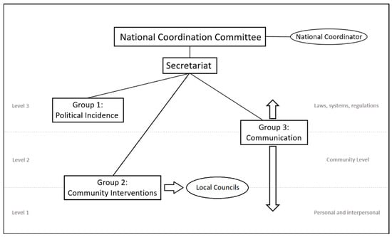 Three working groups were created as the functional structure (Figure 1) made up by professionals of every founding institution (Table 1). Each group has a coordinator/representative chosen by the group members by consensus and is the contact person and is responsible for reporting the group activity to the Secretariat and the National Coordination Committee in the quarterly meetings. Each group has been created to work on all three intervention levels with a different methodology, aiming to achieve multi-component interventions [] that enhance the impact.
