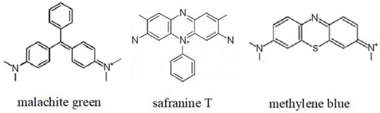 Dyeing wastewater is discharged from cotton, linen, chemical fibers and their blended products, silk-based printing and dyeing, wool dyeing and finishing and silk factories. Dyeing wastewater is very hard to treat because of its large amount of water, high content of organic pollutants, high alkalinity and great change of water quality, which results in dyeing wastewater pollution []. Even more serious, many dyes threaten human health seriously because of their toxic, carcinogenic and mutagenic effects [,,,]. Dyes in the dyeing wastewater could be reused by adsorption and desorption []. In recent years, some new synthetic adsorbents and bio-adsorbents originated from agriculture and food industry waste for the removal of dyes wastewater was found and have attracted a lot of attention, such as Amberlite IRA-938 resin [], starch/poly(alginic acid-cl-acrylamide) nanohydrogel [], orange peel, sawdust, rice husk and spent substrate of Ganodorma lucidum [,,,]. Basic dyes are one of the major categories of dyes, and are suitable for dyeing of acrylic fibers, terylene, nylon, cellulose and protein fiber. Typical basic dyes include the triarylmethane dye malachite green, the azine dye safranine T and the thiazine dye methylene blue. Their chemical structures were shown in Figure 1.