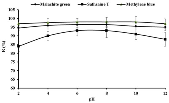 The effect of pH on the removal of malachite green, safranine T and methylene blue from the solutions is shown in Figure 2.