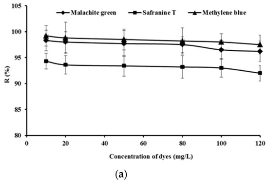 The adsorption removal efficiency of malachite green, safranine T and methylene blue onto SSPE generally decreased with the increase of initial dye concentration from 10 mg/L to 120 mg/L, as shown in Figure 4a.