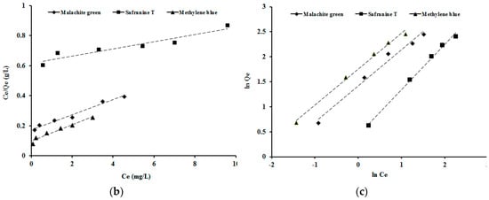 To evaluate the adsorption isotherm of dyes onto adsorbent, the Langmuir and Freundlich models are widely used []. The Langmuir model is suitable for single molecule adsorption, and can be expressed linearly by Equation (3) as follows: