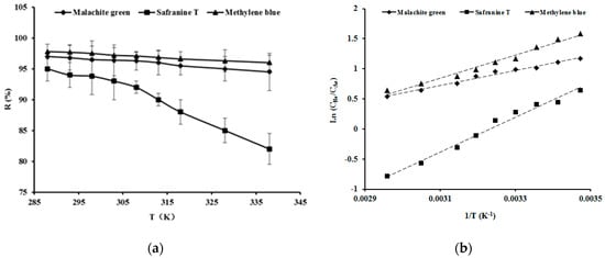 Adsorption removal efficiency of malachite green, safranine T and methylene blue onto SSPE with different temperature at 100 mg/L of initial dyes concentration, 1g of SSFV and 6.0 of pH for 4 h (a), and plots of adsorption thermodynamics (b). The solid lines were experimental data, and dashed lines were the linearized adsorption thermodynamics fitted model.